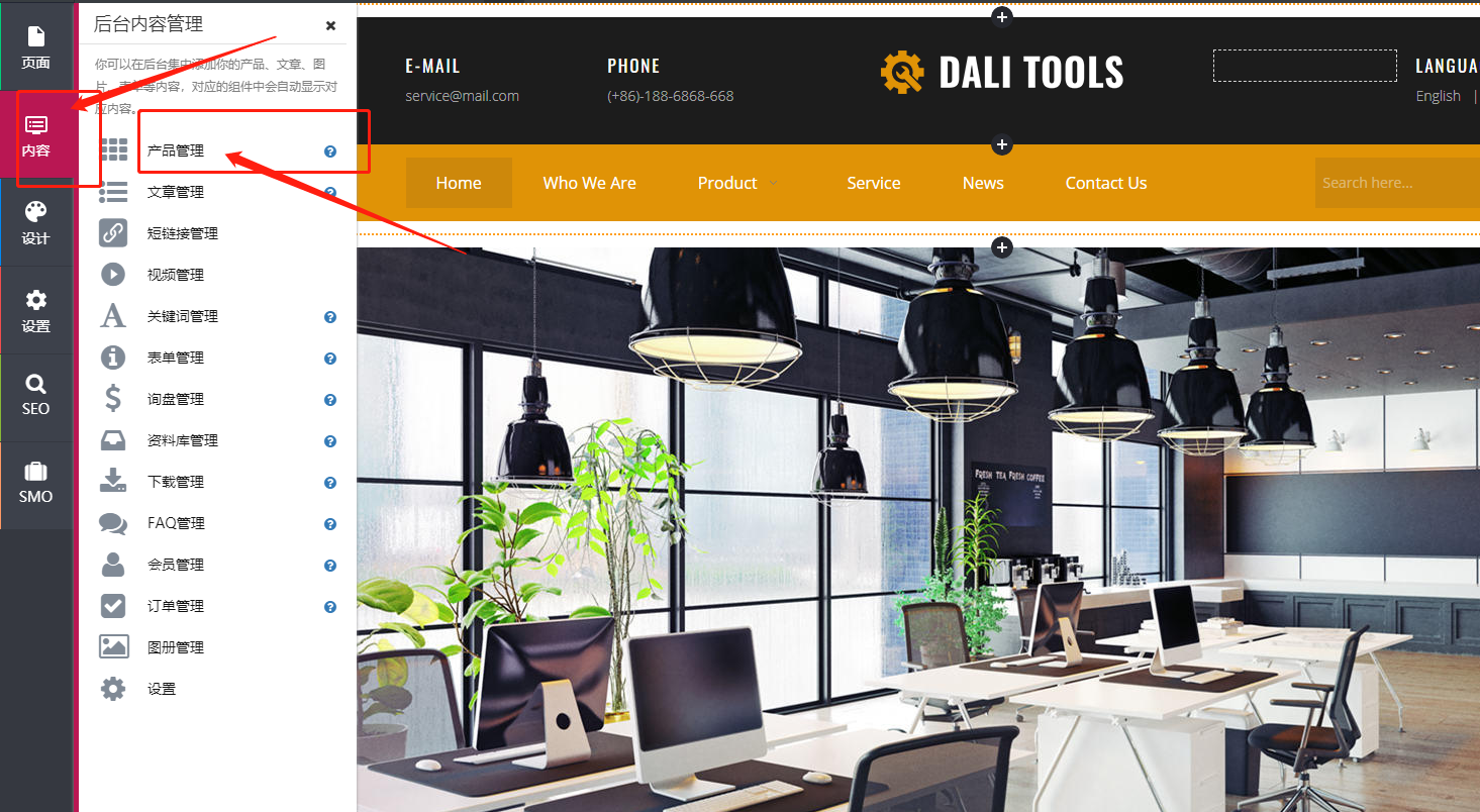 第1步:单击“内容”--》“产品管理”,默认进入“产品管理”页面;