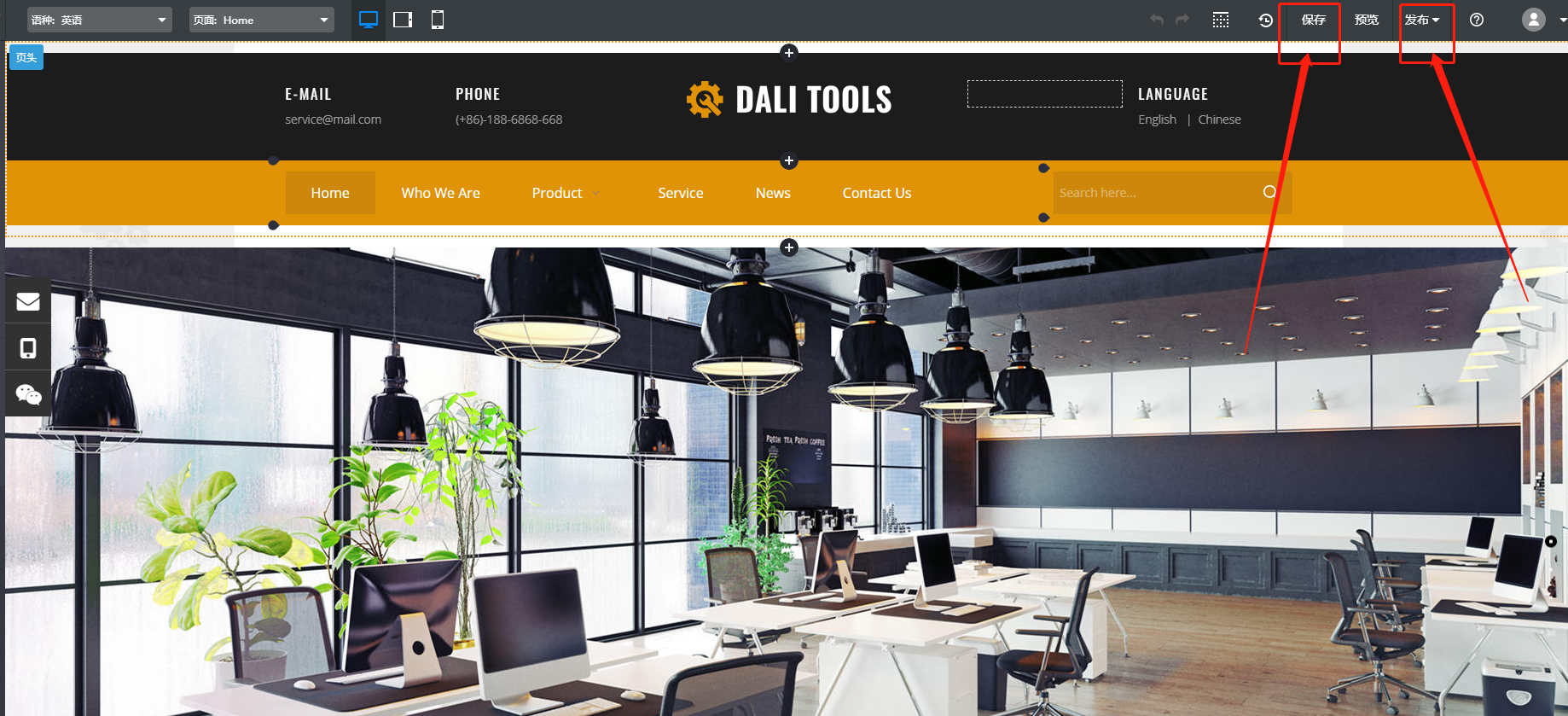 第5步:以上设置好以后,单击页面的”保存“、”发布“按钮,即可把以上设置的结果显示在前台网站上。