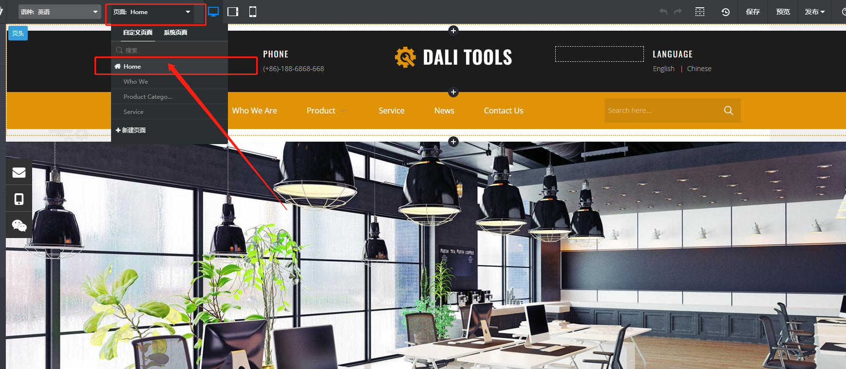 第3步:新热推折产品通常会放在网站首页,先把要操作的页面设置为”当前页面“,把鼠标放到当前页面区域,弹出下拉菜单,找到相应页面,单击,即可切换为当前页面;