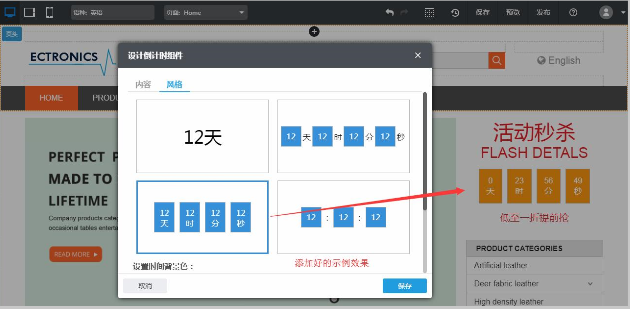 【操作指导】在网站编辑页面,添加“倒计时”组件,在组件“内容”页签下设置活动到期时间、活动未结束的文字、活动已结束的文字,在组件“风格”页签下选择合适的风格,点击“保存”,即可成功添加倒计时组件到页面,操作示例如下所示: