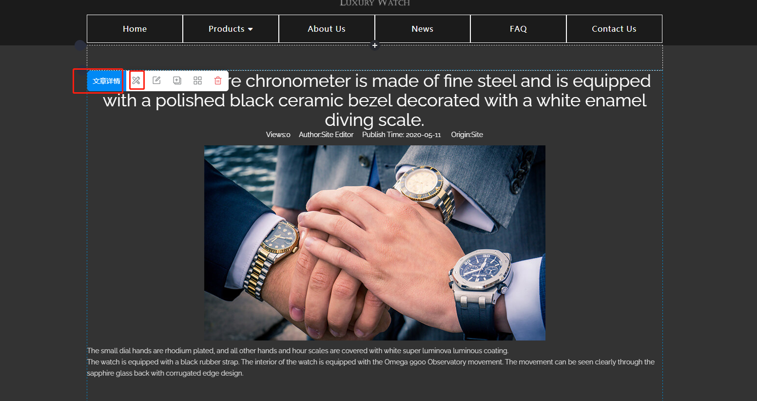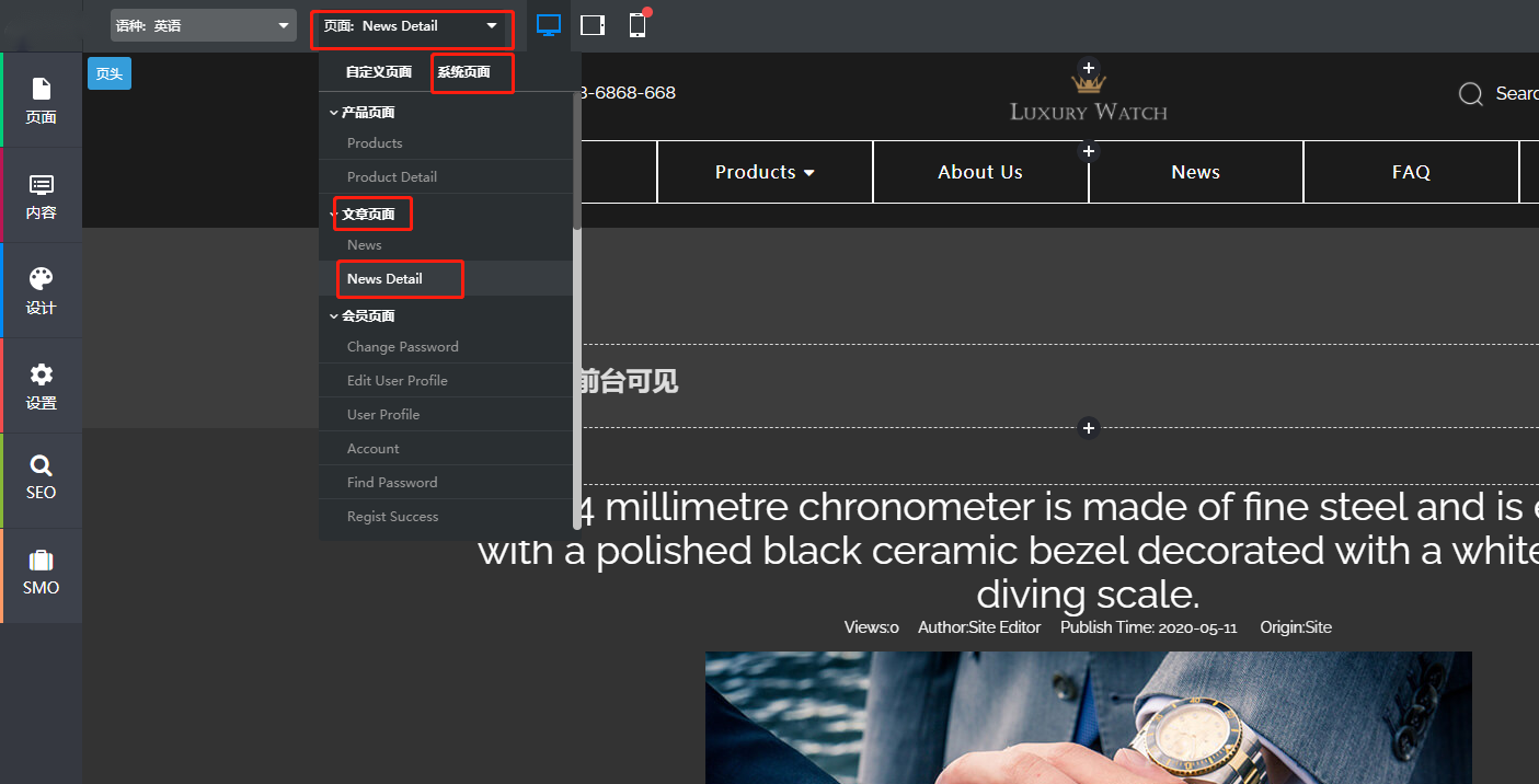 Step1、将当前页面切换为“系统页面--文章系统”中的文章详情页面(英文或小语种即为News Detail)
