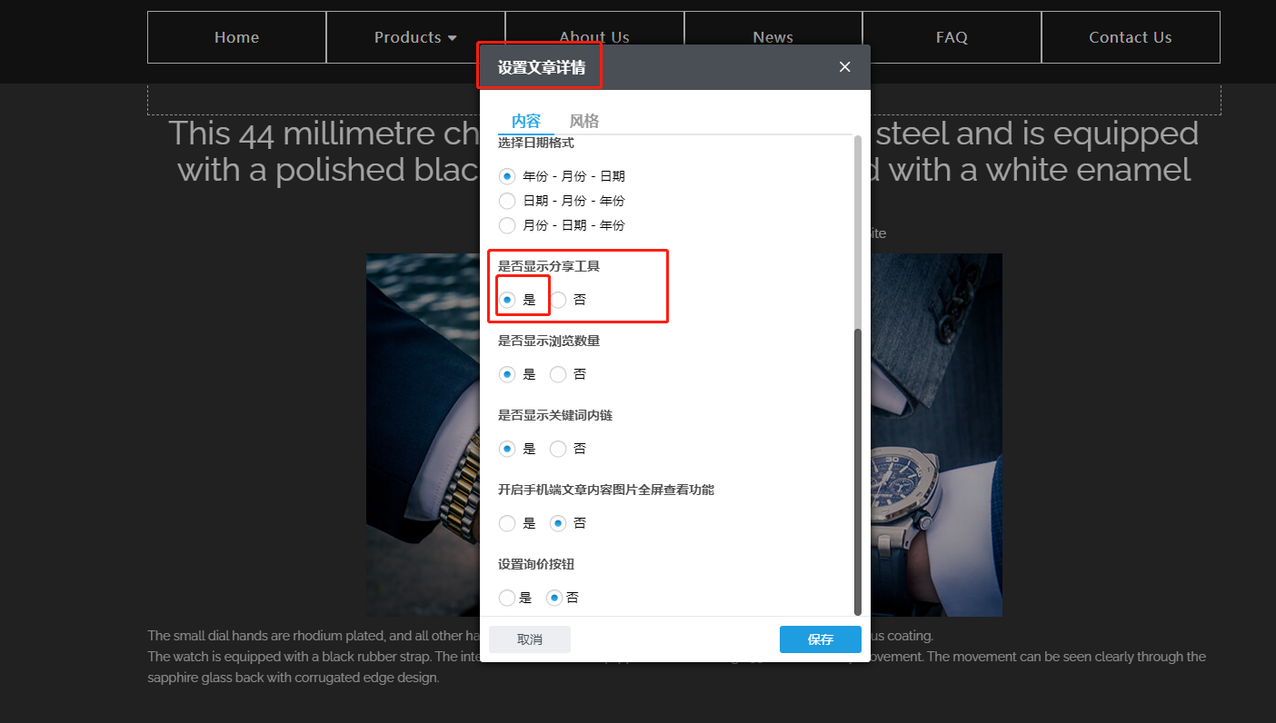 3、在弹出的“设置文章详情”窗口,找到“是否显示分享工具“这一项,选中”开启“即可。