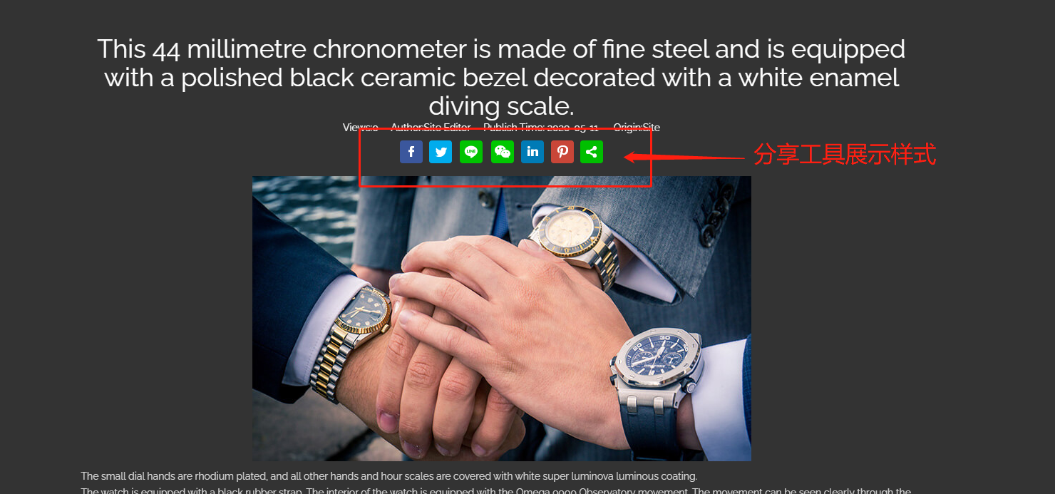 4、然后点击页面右上角的”发布“按钮,即可发布到网站前台。分享按钮在前台展示的形式。这样点击下面的分享按钮即可把这个产品分享到相应的平台上面。