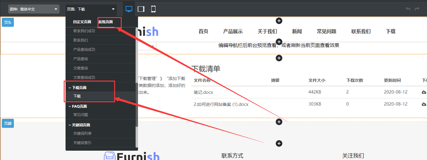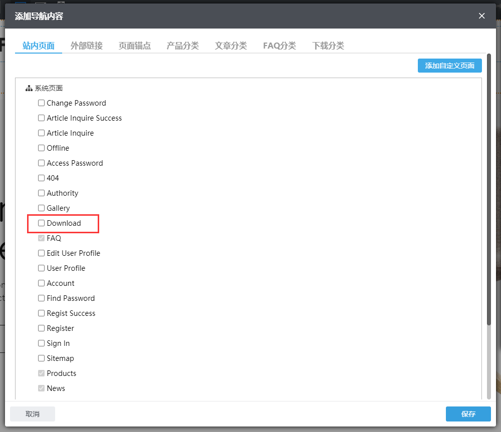 【应用场景】:我们网站的系统页面中有一个下载页面,这个页面为下载总列表页面,在这个页面上可以展示所有的下载分类以及下载文件。那么当客户需要网站页面中包含download页面时,要如何操作才能在导航栏上添加download页面呢?