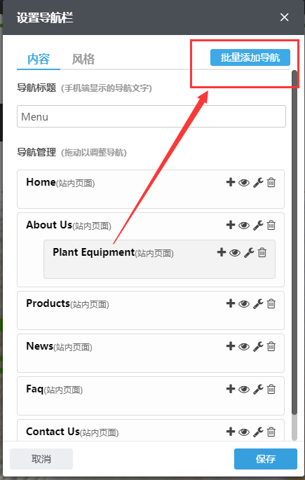 2、点击“编辑”出现设置高级导航,点击“添加导航”/点击“设置”出现设置导航栏,点击“批量添加导航”