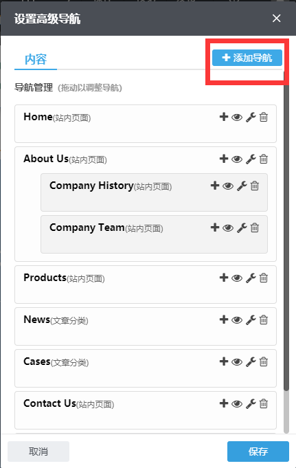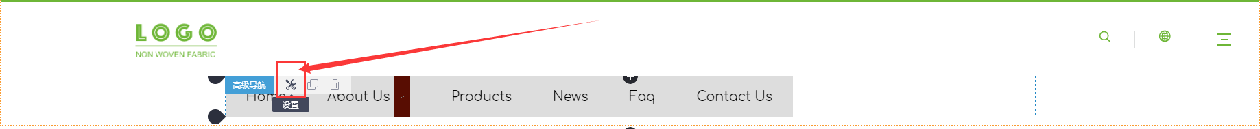 当导航栏为高级导航栏组件时,鼠标悬停在导航栏区域,出现“小扳手”,点击小扳手