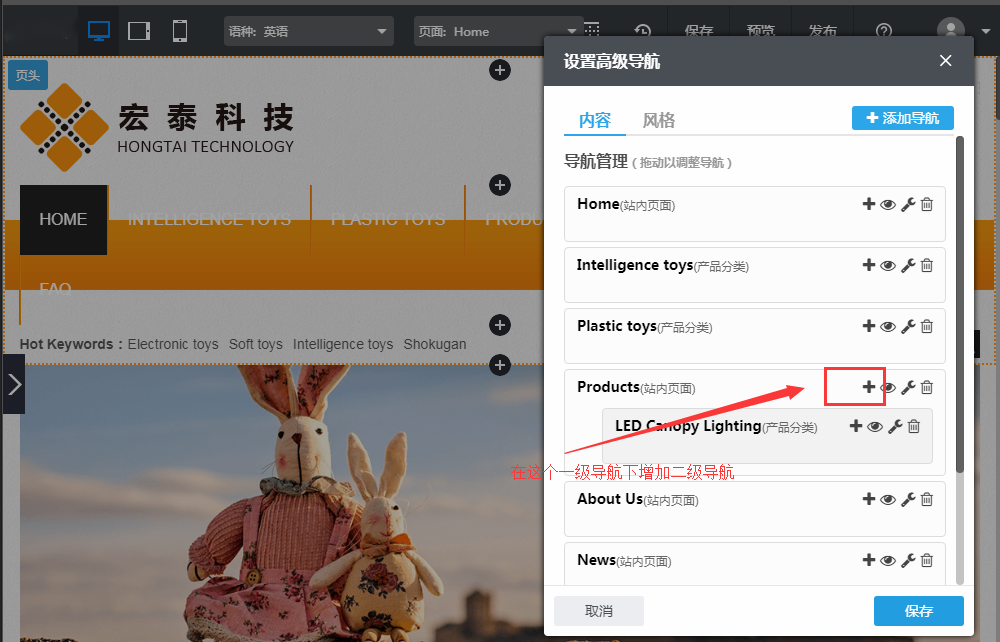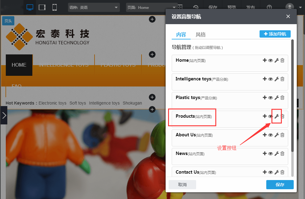 1.首先我们要知道怎样去增加导航,组件-》设置-》内容-》点击“+”;