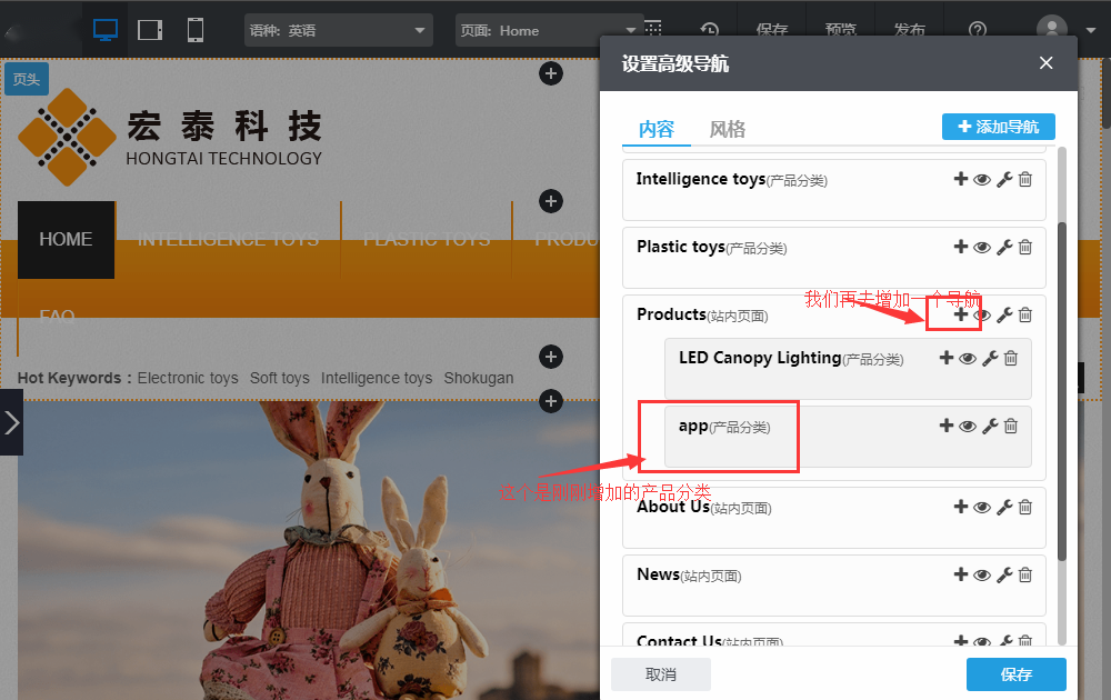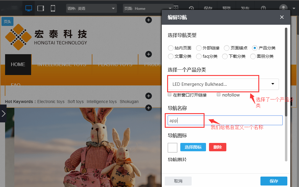 3.在编辑导航里,我们选择好产品分类后,可以给这个导航自定义个名称:比如说我们选择了产品分类:LED Emergency Bulkhead,然后去导航名称中修改成app,那在导航中是直接显示成“app”的;
