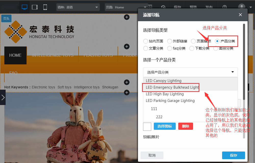 5.在添加导航的页面中,我们可以看到之前的LED Emergency Bulkhead显示为灰色,鼠标点击上去是无法选择的,虽然在首页导航上我们看不到这个显示为LED Emergency Bulkhead的导航项,(因为在我们在以上设置中,给他的导航名称改为了app),但是它是被其他导航选择了,所以我们无法再选择这个LED Emergency Bulkhead这个分类;