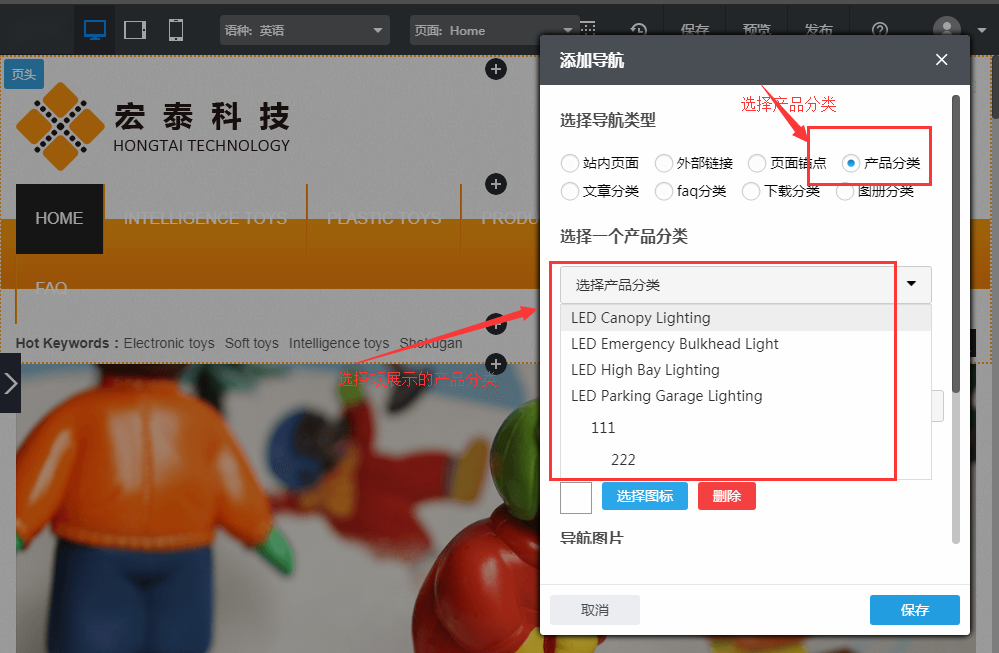 2.点击“+”进入到添加导航中,选择需要增加的类型,这里我们以产品分类为例:选择产品分类-》选择一个产品分类-》保存;