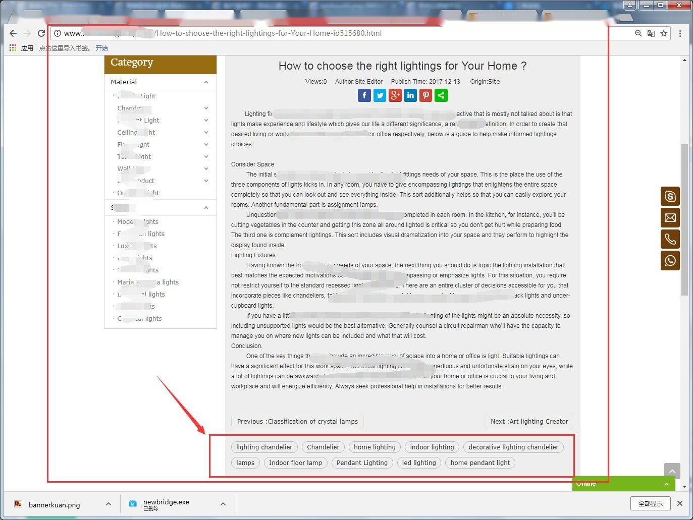 2)这些文章关键词都带有该关键词页面的链接,链接结构形如:{域名}/news/{关键词}.html,以文章关键词lighting chandelier为例,前台该关键词对应的URL就是:{域名}/news/lighting+chandelier.html。单击该关键词,就进入到如下这个关键词对应的文章页面,该关键词被几篇文章应用到(即该关键词出现在这些文章的文章关键词处),就会在下方列出几篇文章,因此,建议一个关键词被多篇文章用到。