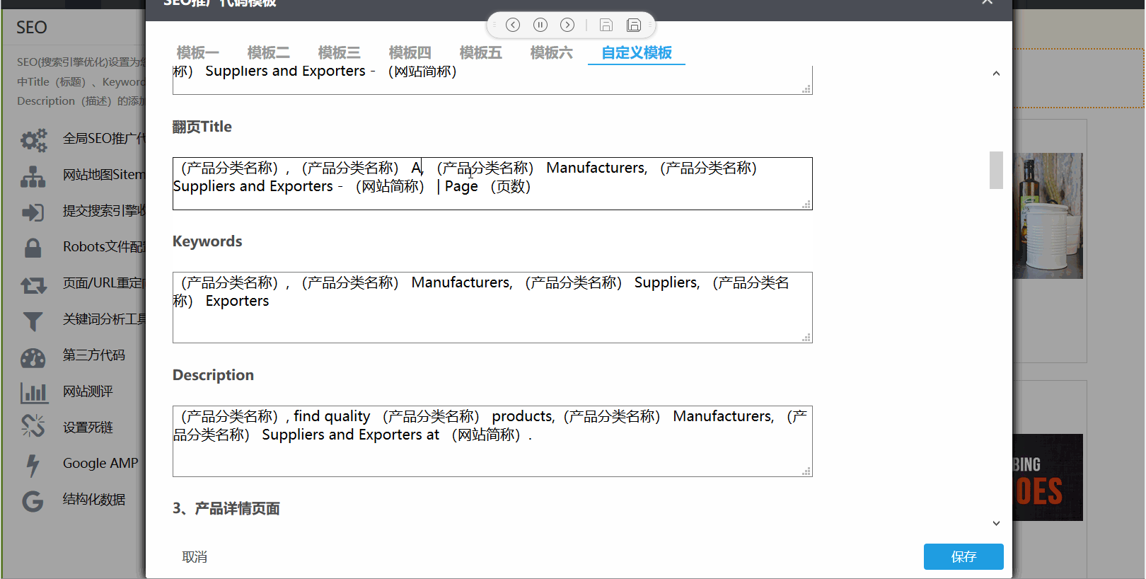 【操作指导】在网站编辑页面,点击全局SEO推广代码设置后选择自定义模板,便可以进行编辑,如下图所示: