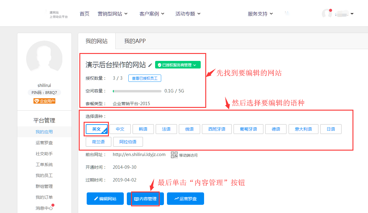 第2步:在“我的应用”-->“我的网站”中找到要编辑的网站,选择要编辑的语种,最后单击“内容管理”按钮,进入内容管理界面;