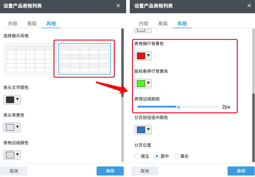 【操作指导】进入“编辑网站”界面,选择“添加组件”-“产品组件”-“产品表格列表”,在“风格”页签中选择第2种展示风格,并在下方设置隔行背景色、鼠标悬停背景色、遗迹边线粗细即可,操作如下图所示: