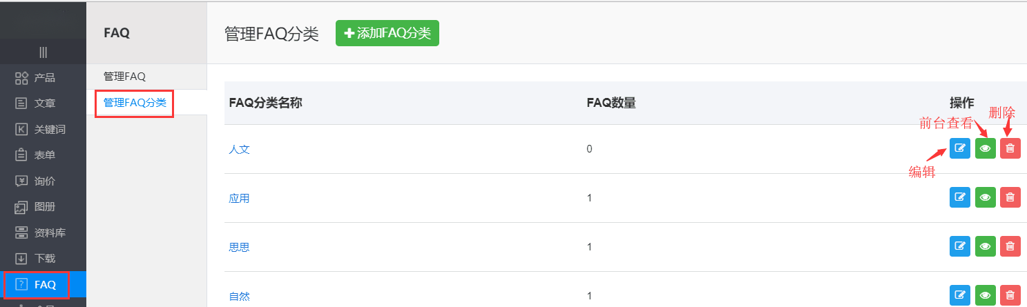 支持对FAQ分类进行以下操作:添加,编辑,前台查看,删除。