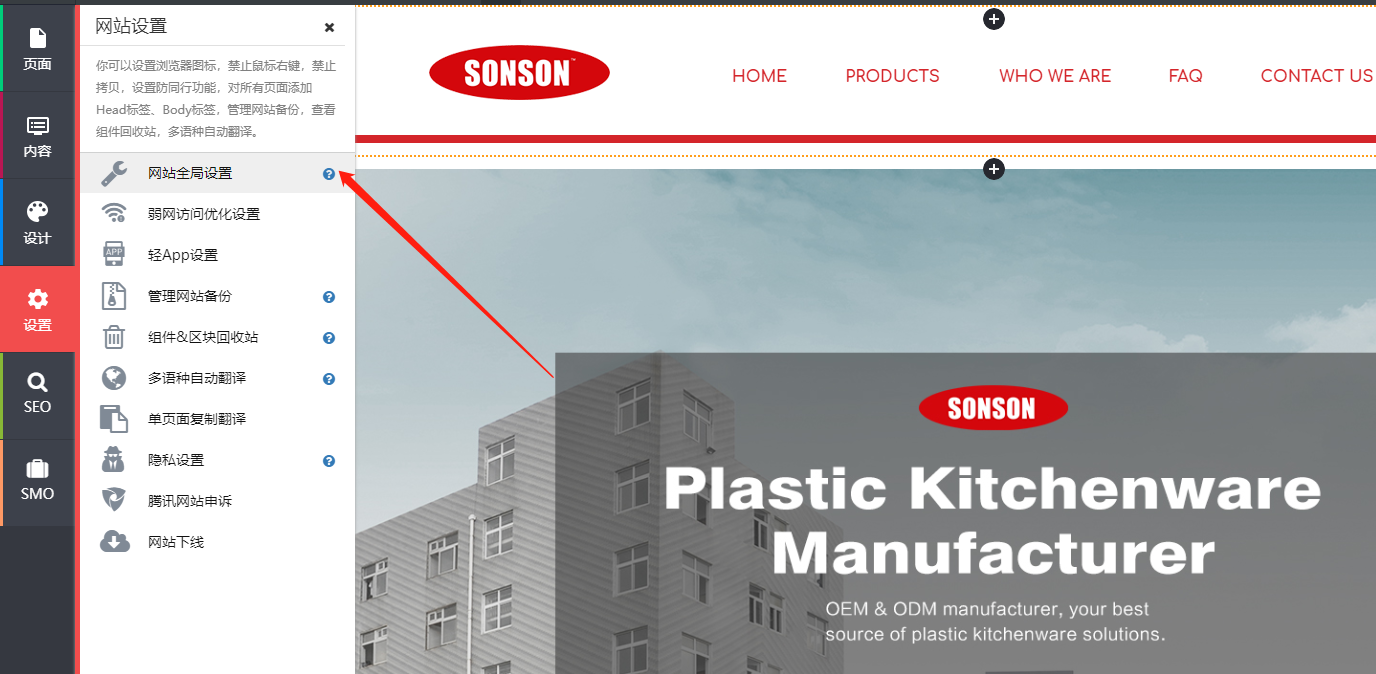 3.打开网站后台,在设置中点击网站全局设置