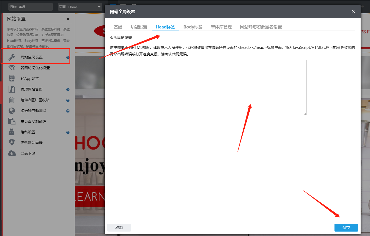 4.在网站全局设置中点击Head标签,将站长代码段添加到下方区域,点击保存