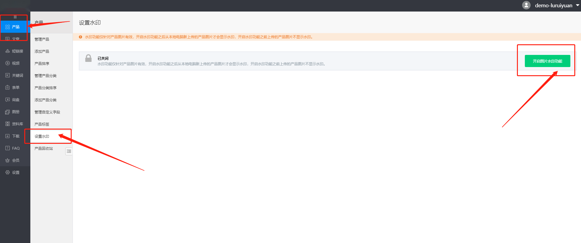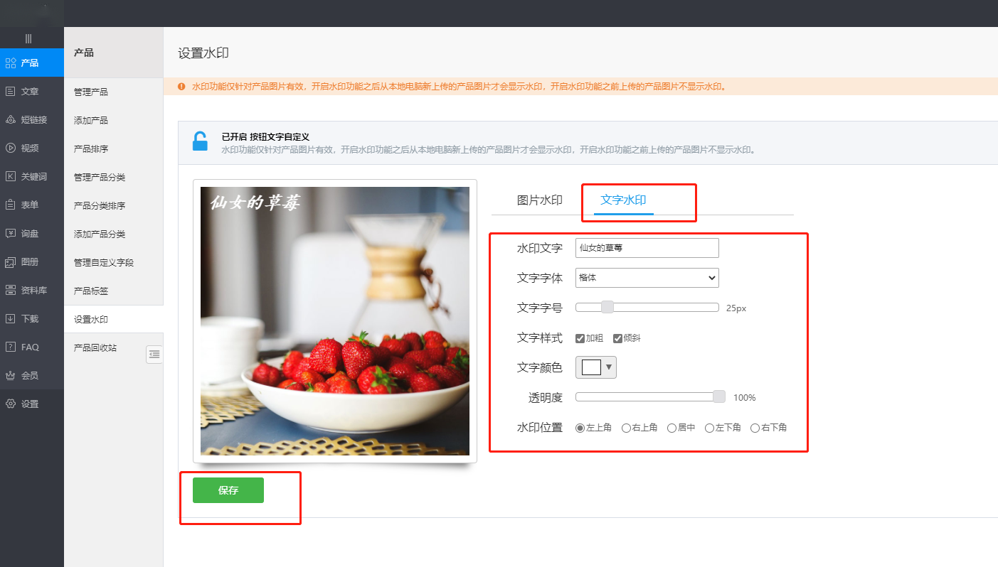 第2步:单击“设置水印”按钮,然后单击“开启图片水印功能”按钮,设置图片水印或文字水印,然后单击“保存”。开启此功能之后再上传的产品图片才会有水印,开启之前上传的产品图片是没有水印的,需要把产品图片删除掉再从本地电脑上传。此功能不需要发布网站即可生效。