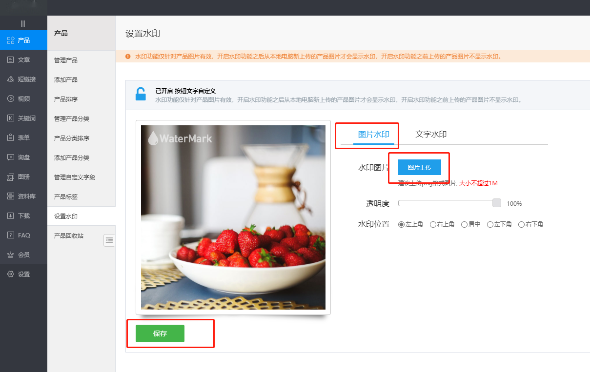 请注意:需要先开启产品图片水印功能,再从本地电脑上传的产品图片才会出现水印(如果从资料库中选择在开启水印功能之前上传的图片不会出现水印),在开启水印功能之前上传的产品图片不会显示水印。