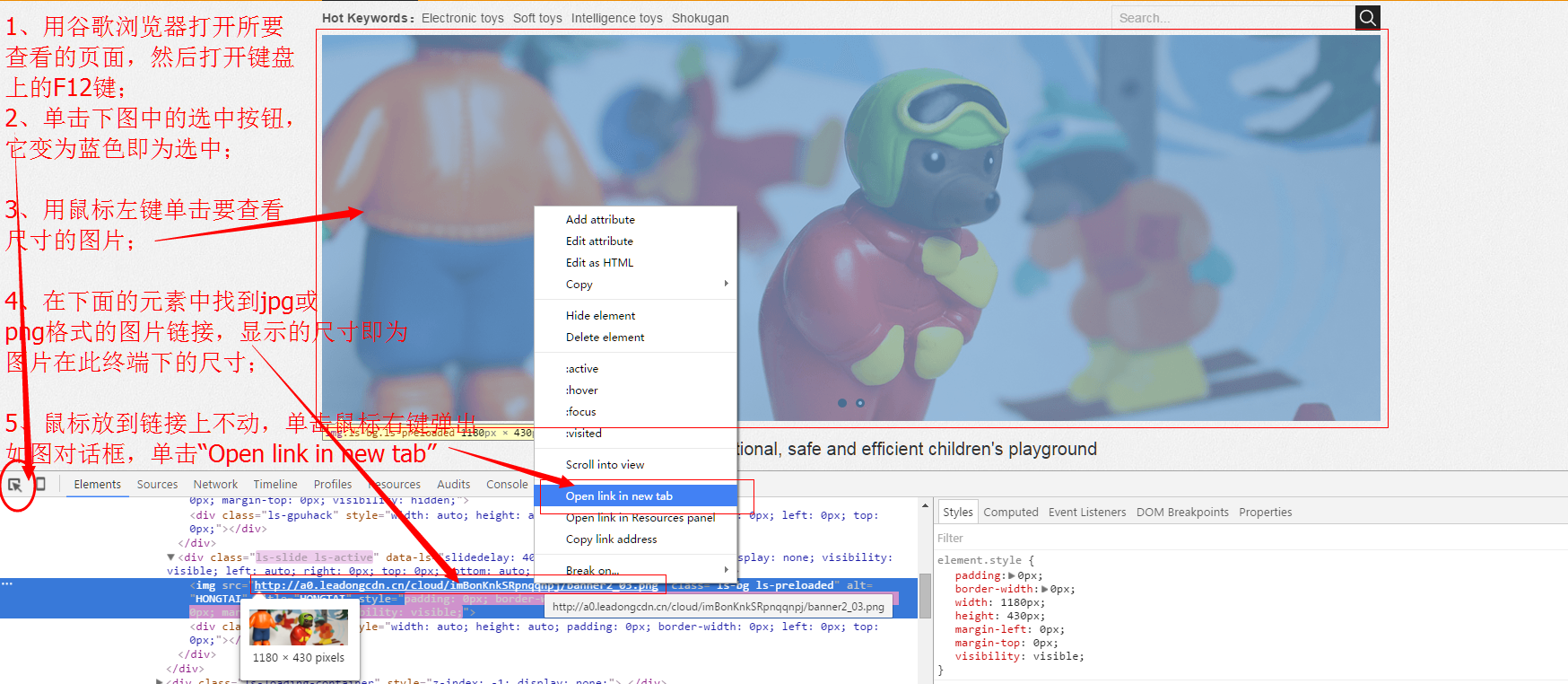 第1种情况:按键盘上的F12键打开“开发者工具”,单击放大镜图标,然后把鼠标移到对应的图片上,会显示每个图片的尺寸。
