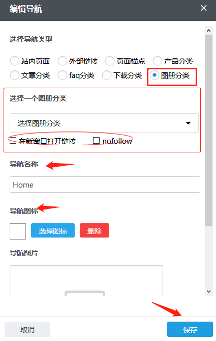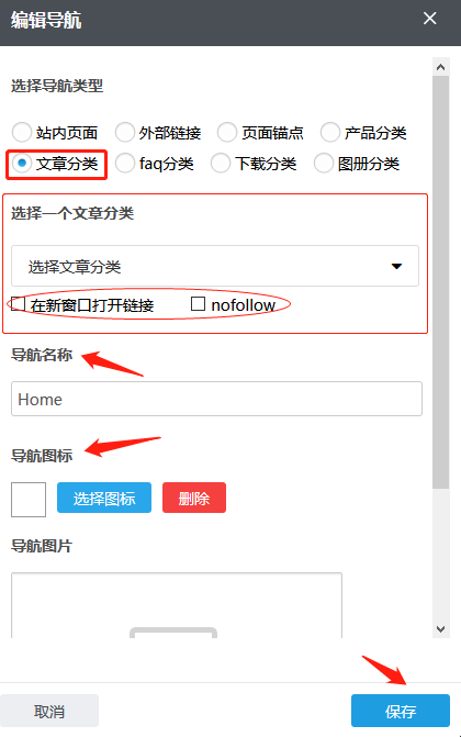 根据需要您可以在已有的文章分类中选择,导航名称自动生成也可根据需要修改;如果您需要在点击这个导航时令其在新窗口打开,您可以在“新窗口打开链接”前的方框上打钩,反之无需打钩。根据需要,您可以点击“选择图标”选择合适的导航图标;也可以在“导航图片”内添加图片,首次添加这张图片,需要通过“本地上传”按钮传上来;若之前传过的图片,默认是保存在资料库里的,这种情况也可以通过“从资料库选择”按钮到资料库选择这张图片;如果误操作或不再需要导航图片点击“清除”即可;
