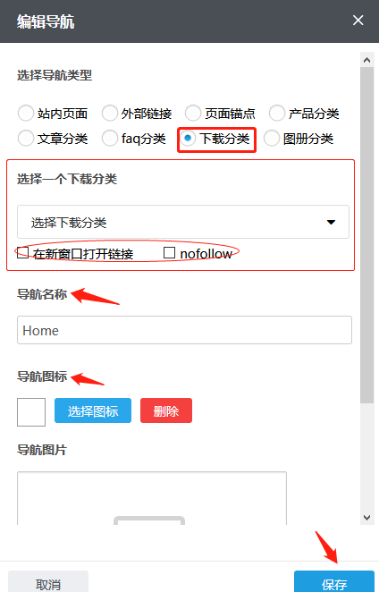 根据需要您可以在已有的下载分类中选择,导航名称自动生成也可根据需要修改;如果您需要在点击这个导航时令其在新窗口打开,您可以在“新窗口打开链接”前的方框上打钩,反之无需打钩。根据需要,您可以点击“选择图标”选择合适的导航图标;也可以在“导航图片”内添加图片,首次添加这张图片,需要通过“本地上传”按钮传上来;若之前传过的图片,默认是保存在资料库里的,这种情况也可以通过“从资料库选择”按钮到资料库选择这张图片;如果误操作或不再需要导航图片点击“清除”即可;