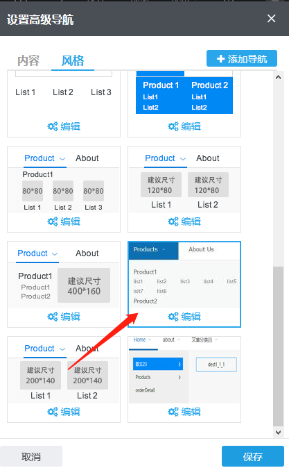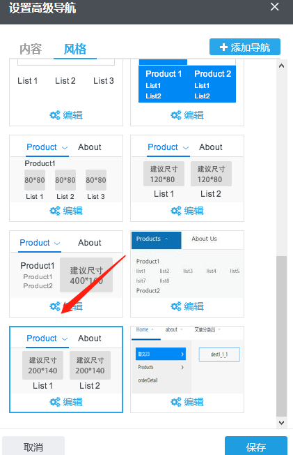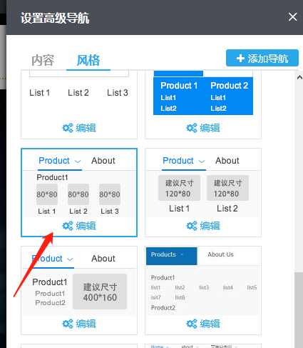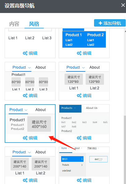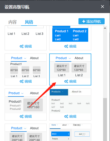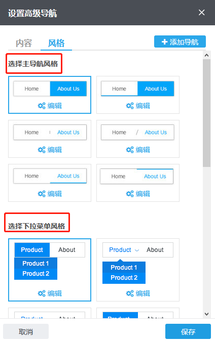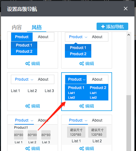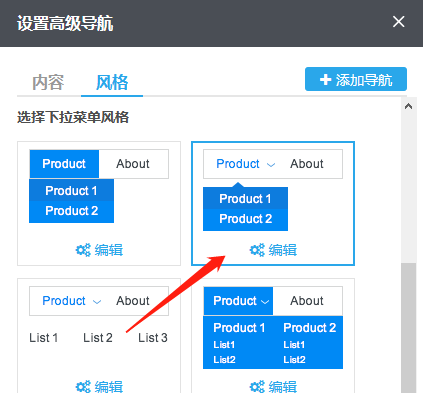 1)风格--选择主导航风格:单击“风格“即可切换到风格标签,在这里可以选择主导航(即一级导航)风格