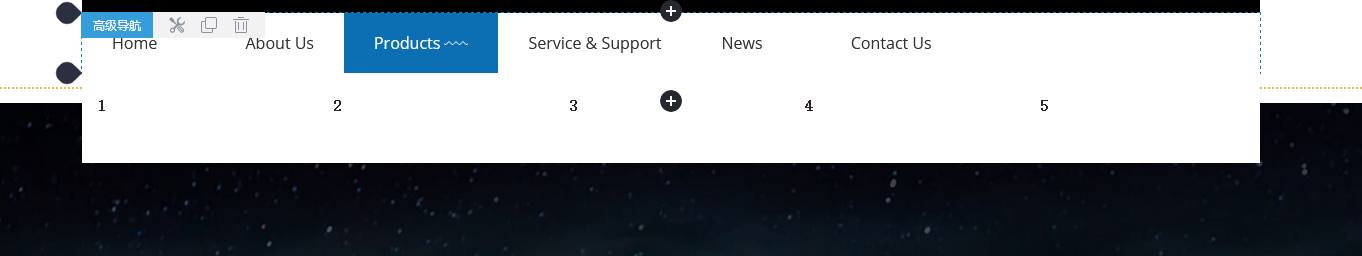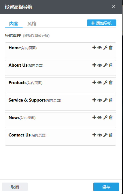【应用场景】一般添加到网站的页头区域,因为页头区域是整个网站通用的,这样整个网站就可以通用这一个导航,在一个页面增加/删除/修改导航,其他页面也会一起变化。高级导航组件的设置项中支持单个或批量添加站内页面、外部链接、页面锚点、产品分类、文章分类多种类型的页面作为导航,可以拖动调整导航的层级以及调整导航的顺序。高级导航组件的风格中支持选择多种主导航风格、下拉菜单风格以及自定义导航的高度、宽度、导航颜色、文字颜色等多种设置项。高级导航组件堪称为一个导航编辑器。