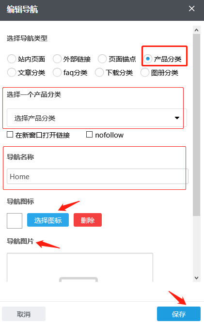 根据需要您可以在已有的产品分类中选择,导航名称自动生成也可根据需要修改;如果您需要在点击这个导航时令其在新窗口打开,您可以在“新窗口打开链接”前的方框上打钩,反之无需打钩。根据需要,您可以点击“选择图标”选择合适的导航图标;也可以在“导航图片”内添加图片,首次添加这张图片,需要通过“本地上传”按钮传上来;若之前传过的图片,默认是保存在资料库里的,这种情况也可以通过“从资料库选择”按钮到资料库选择这张图片;如果误操作或不再需要导航图片点击“清除”即可;