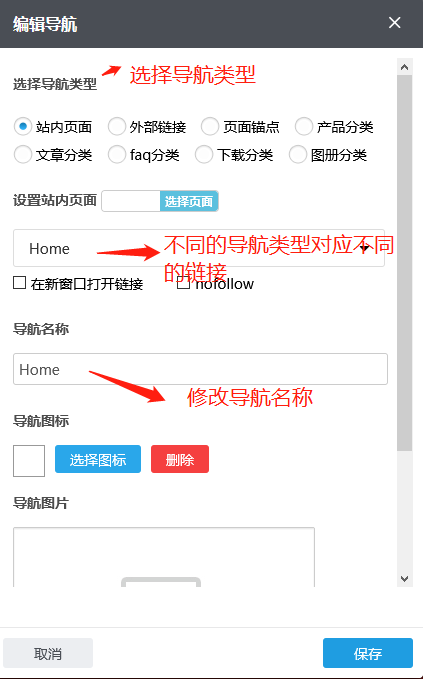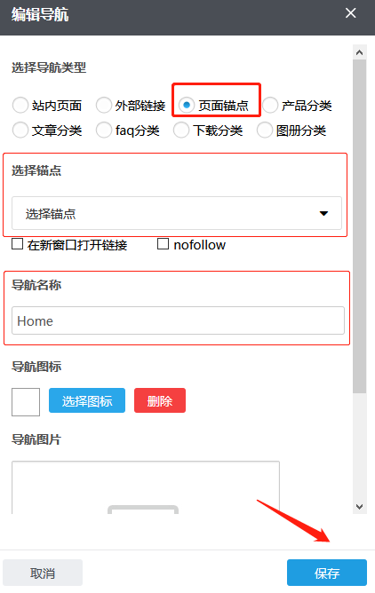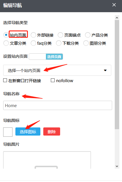 根据需要您可以在已有的锚点中选择,导航名称自动生成也可根据需要修改;如果您需要在点击这个导航时令其在新窗口打开,您可以在“新窗口打开链接”前的方框上打钩,反之无需打钩。根据需要,您可以点击“选择图标”选择合适的导航图标;也可以在“导航图片”内添加图片,首次添加这张图片,需要通过“本地上传”按钮传上来;若之前传过的图片,默认是保存在资料库里的,这种情况也可以通过“从资料库选择”按钮到资料库选择这张图片;如果误操作或不再需要导航图片点击“清除”即可;