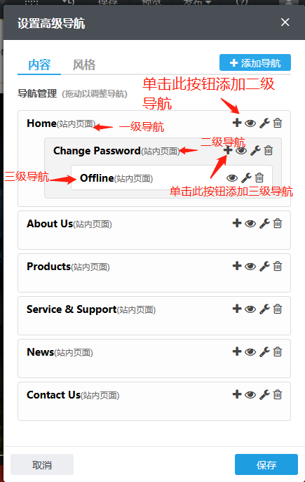 内容--添加子导航:最多支持三级导航,多了也不利于网站推广。单击要添加二级导航的一级导航后面的加号+,如下图所示,二级/三级导航可添加的类型与一级导航的类型是一样的;