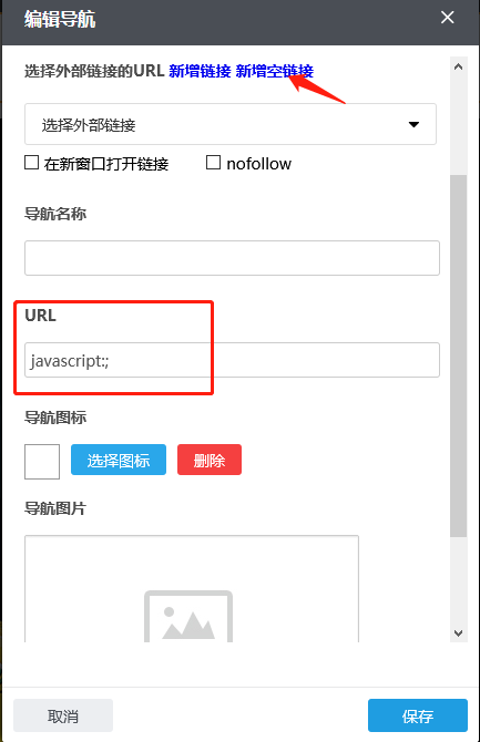 点击选择外部链接的URL后蓝色的“新增空链接”,即在URL栏中出现javascript:;,此URL不需要修改;如果您需要在点击这个导航时令其在新窗口打开,您可以在“新窗口打开链接”前的方框上打钩,反之无需打钩。根据需要,您可以点击“选择图标”选择合适的导航图标;也可以在“导航图片”内添加图片,首次添加这张图片,需要通过“本地上传”按钮传上来;若之前传过的图片,默认是保存在资料库里的,这种情况也可以通过“从资料库选择”按钮到资料库选择这张图片;如果误操作或不再需要导航图片点击“清除”即可;