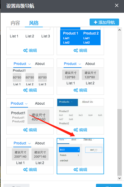 风格--主导航风格的编辑:在导航设置中可以根据需要选择导航的位置,也可以选择导航宽度的自适应状态。