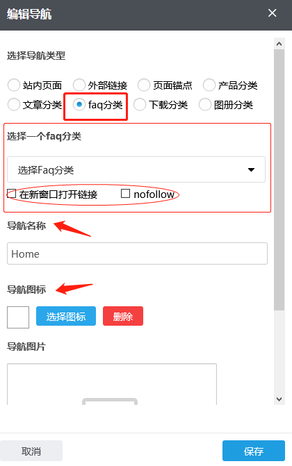 根据需要您可以在已有的faq分类中选择,导航名称自动生成也可根据需要修改;如果您需要在点击这个导航时令其在新窗口打开,您可以在“新窗口打开链接”前的方框上打钩,反之无需打钩。根据需要,您可以点击“选择图标”选择合适的导航图标;也可以在“导航图片”内添加图片,首次添加这张图片,需要通过“本地上传”按钮传上来;若之前传过的图片,默认是保存在资料库里的,这种情况也可以通过“从资料库选择”按钮到资料库选择这张图片;如果误操作或不再需要导航图片点击“清除”即可;