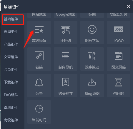 第二步:添加高级导航组件。在基础组件中,单击“高级导航”组件,弹出“设置高级导航”对话框。选择好导航之后可以先单击“保存”按钮即可添加网站高级导航组件。