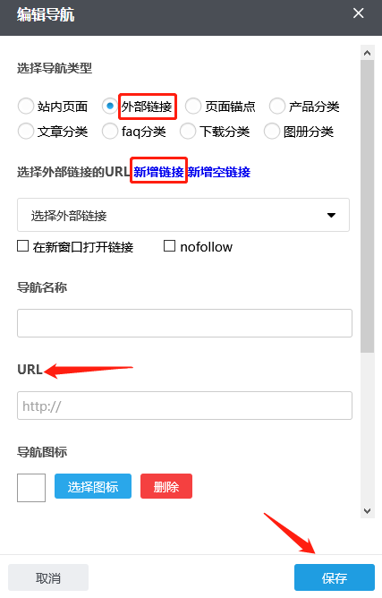 点击选择外部链接的URL后蓝色的“新增链接”,即在URL栏中出现http://,根据需要,您可以填完整URL栏及导航名称,如果您需要在点击这个导航时令其在新窗口打开,您可以在“新窗口打开链接”前的方框上打钩,反之无需打钩。根据需要,您可以点击“选择图标”选择合适的导航图标;也可以在“导航图片”内添加图片,首次添加这张图片,需要通过“本地上传”按钮传上来;若之前传过的图片,默认是保存在资料库里的,这种情况也可以通过“从资料库选择”按钮到资料库选择这张图片;如果误操作或不再需要导航图片点击“清除”即可;