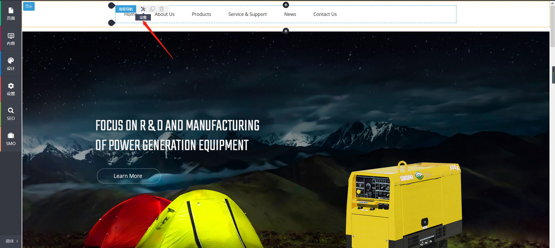 添加了高级导航组件,可以对组件内容和风格进行设置。把鼠标放到网站导航内容区域,组件左上角出现组件名称“高级导航”,把鼠标放到这四个字眼上,右侧出现一排小按钮,单击第一个即设置按钮,弹出设置高级导航栏对话框。