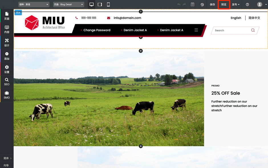 (1)第一步: 在网站编辑器中修改页面并保存,点击“预览”按钮进入“网站预览页”;