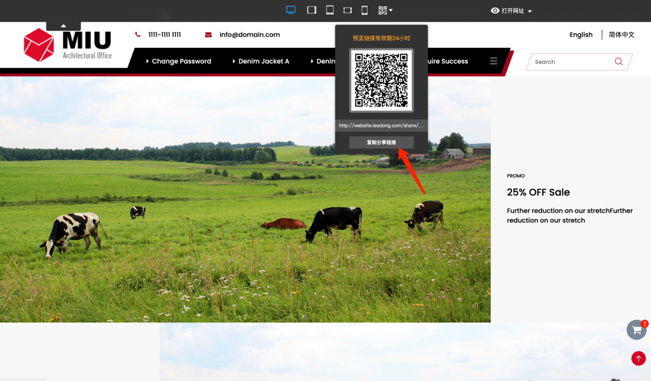 网站编辑器的预览页新增“预览分享”入口,实现对外分享“网站预览页面”功能。用户可以在不影响线上站点运营的情况下,对外分享预览链接或二维码,接收到的用户可在24小时内实时查看站点各页面的修改操作,进而实时把握建站进度,扩大网站预览功能的应用场景。