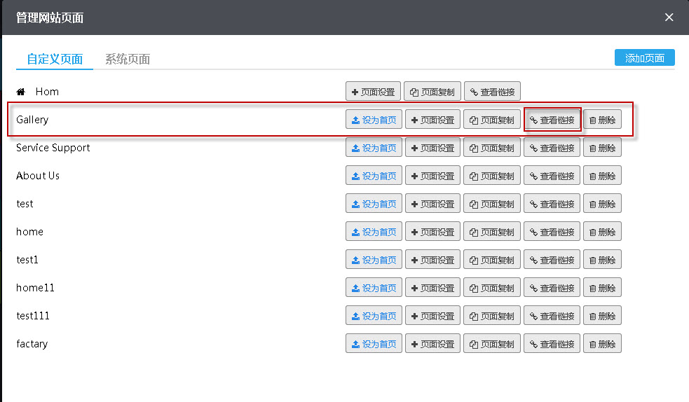 3、找到其中一个页面,单击页面后面的”查看链接“按钮,弹出页面链接查看窗口,在这里可以看到当前页面的站内地址、网络访问地址。