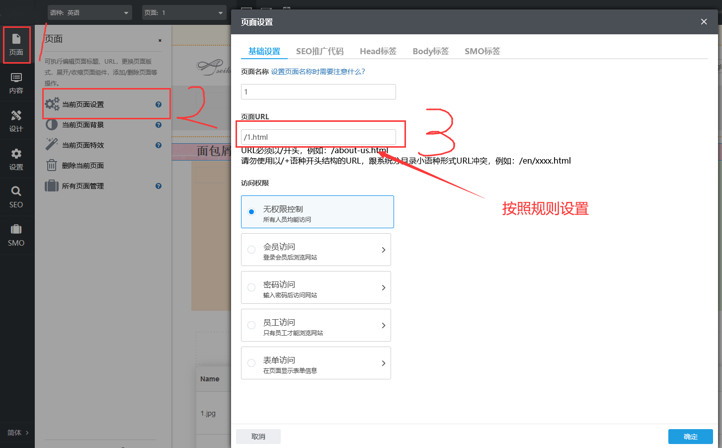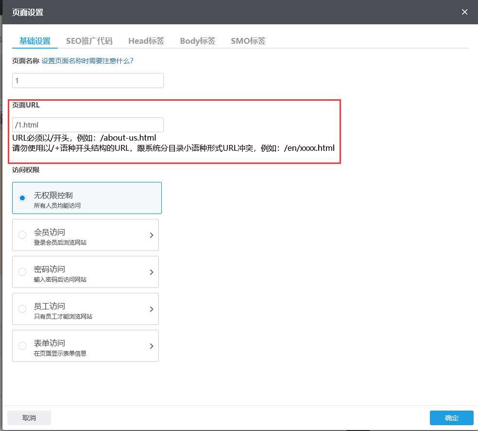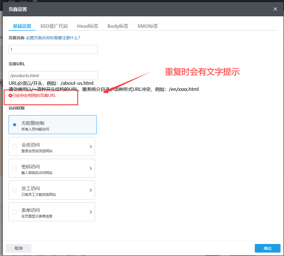 如果设置的URL与系统页面有重复,下面会有文字提示哦!