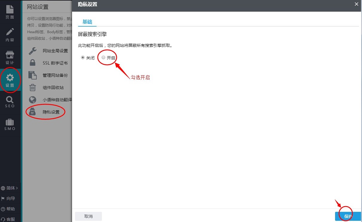 只需要去开启“屏蔽搜索引擎”功能就可以,操作方法如下: