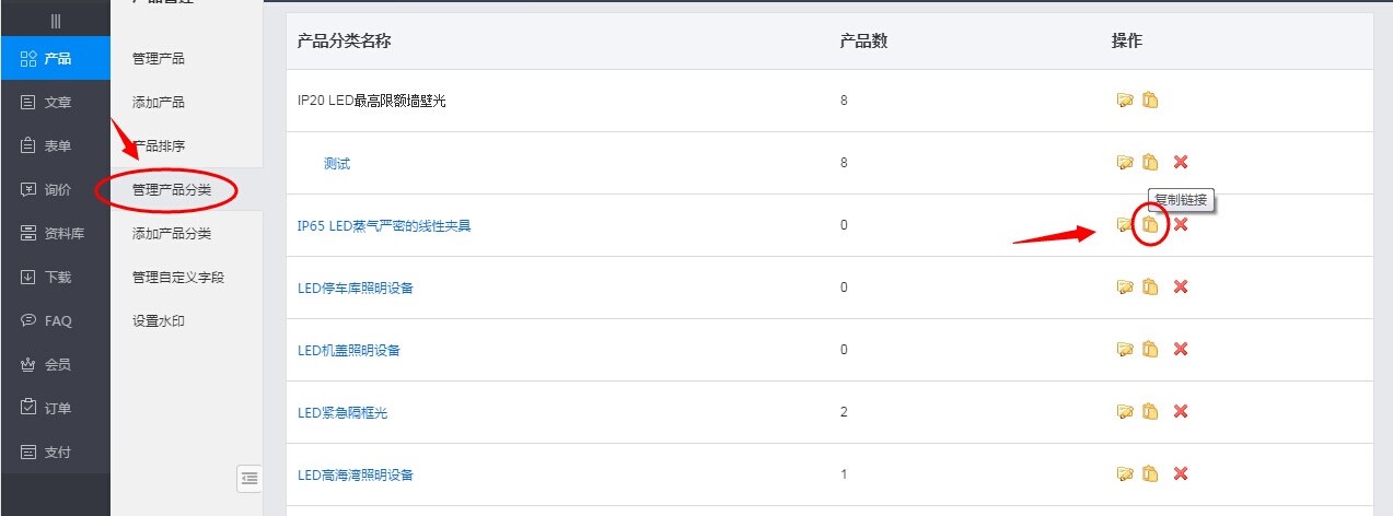 第2步:单击“管理产品分类”按钮进入管理产品分类页面找到需要复制链接的分类,单击后台的复制链接按钮,即可把此产品分类的网络访问地址复制下来。