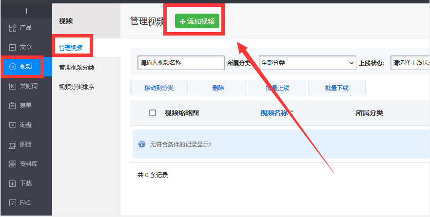 2、视频分类添加好了后,我们需要添加视频。添加入口:内容管理后台—视频—管理视频,点击最上方“添加视频”绿色按钮。如下图所示: