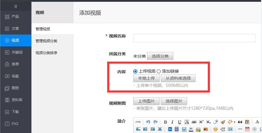 点击进入后,可设置视频名称、视频所属分类、内容、视频附图、视频简介。这边要着重说一下“内容”这块,首先我们的视频必须是MP4格式的,其次内容这里我们分为两种类型:“上传视频”和“添加链接”。如下图所示: