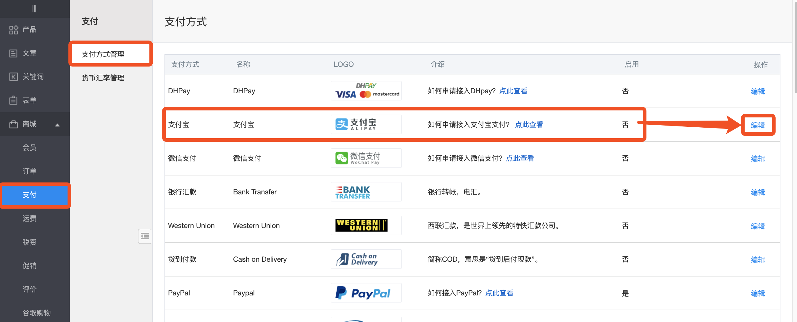 点击编辑后,启用支付宝,并将以上参数设置到对应的位置,如下截图所示设置:
