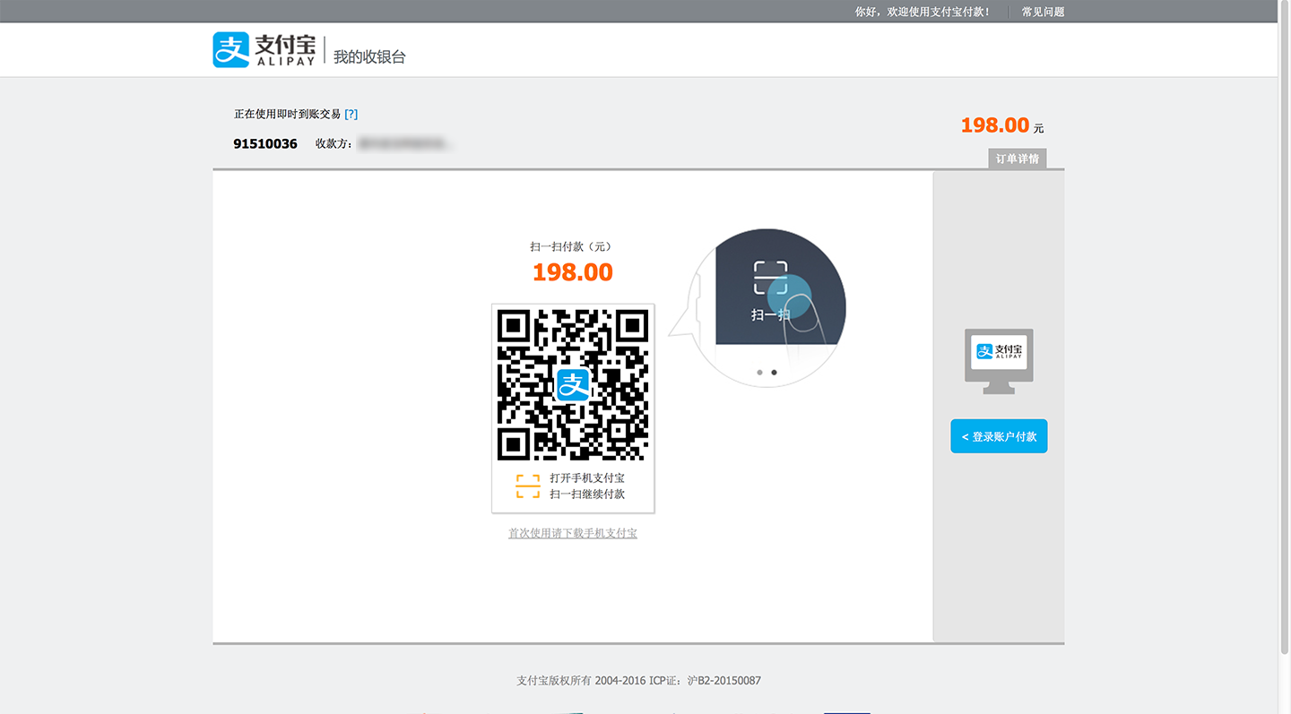 2. 买家选择付款方式,可以选择手机扫一扫付款或者选择在电脑端登录账户付款