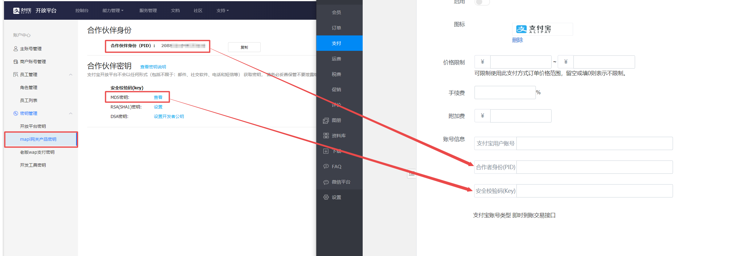 合作者身份(PID)获取的步骤:选择账户中心中的"密钥管理",点击"mapi网关产品密钥",在出现的页面中复制合作伙伴身份(PID)