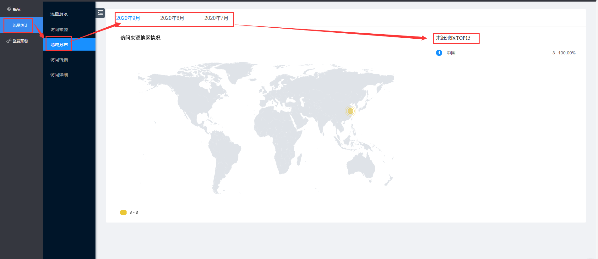 点击左侧栏内的“流量统计”→“流量总览”,可查看到最近三个月访问国家的占比