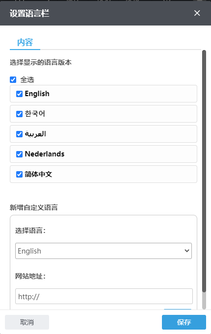 注:如果语言栏语种为新增自定义语言非系统勾选情况下,不支持调整上下顺序及设置默认语言栏。